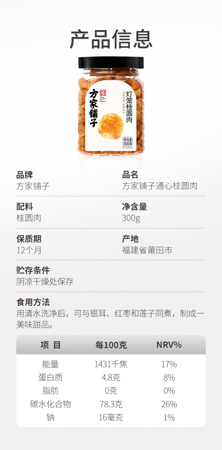 方家铺子中华老字号 灯笼桂圆肉300g 6A肉厚龙眼干肉无核桂圆干