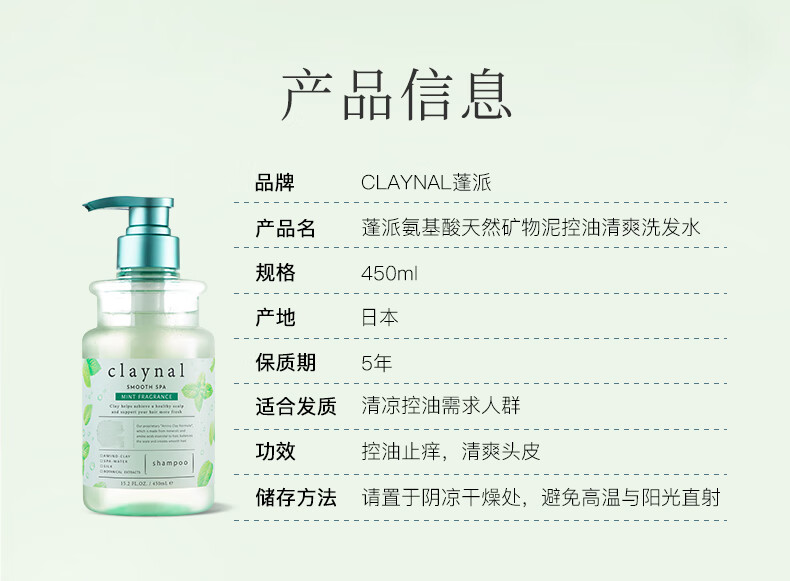 蓬派(CLAYNAL)洗发水控油止痒清爽薄荷洗头膏450ml男女通用氨基酸无硅油