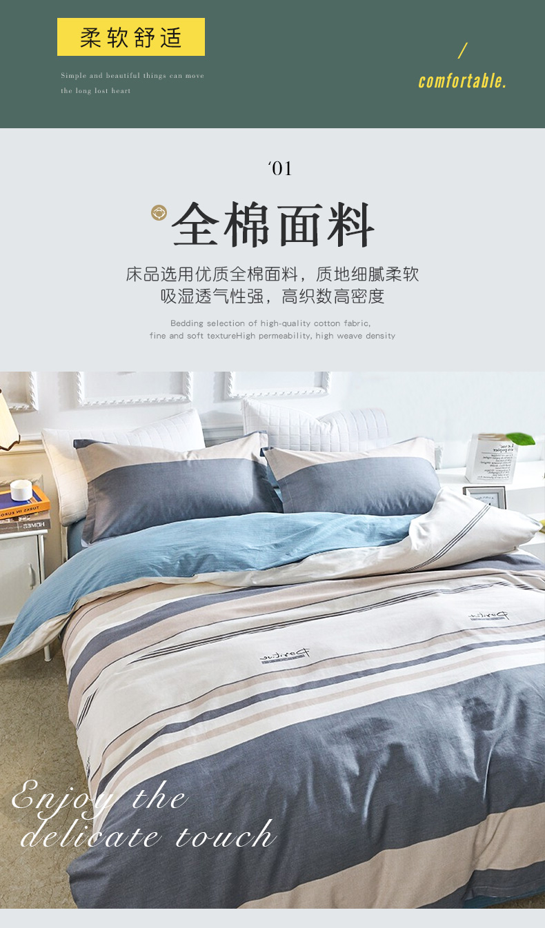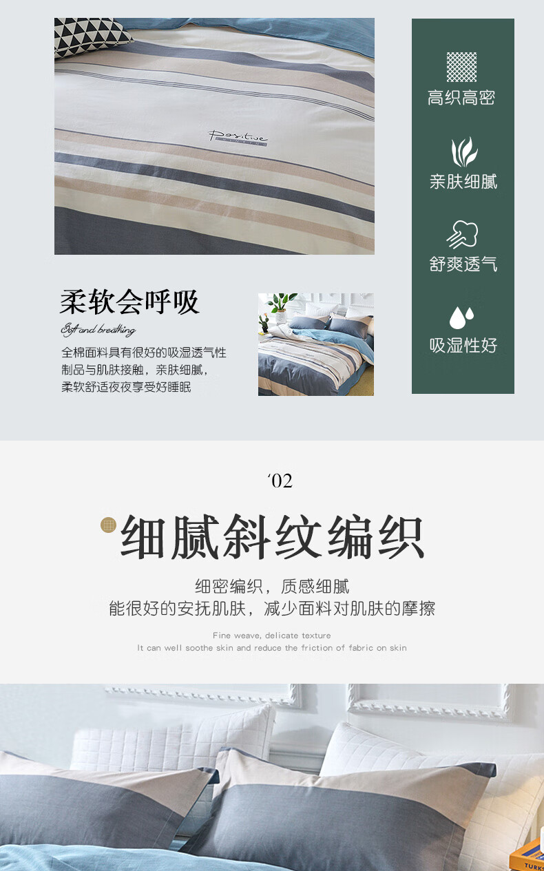 南极人全棉三件套 简约纯棉斜纹床上单人学生宿舍被套床单枕套150x200cm