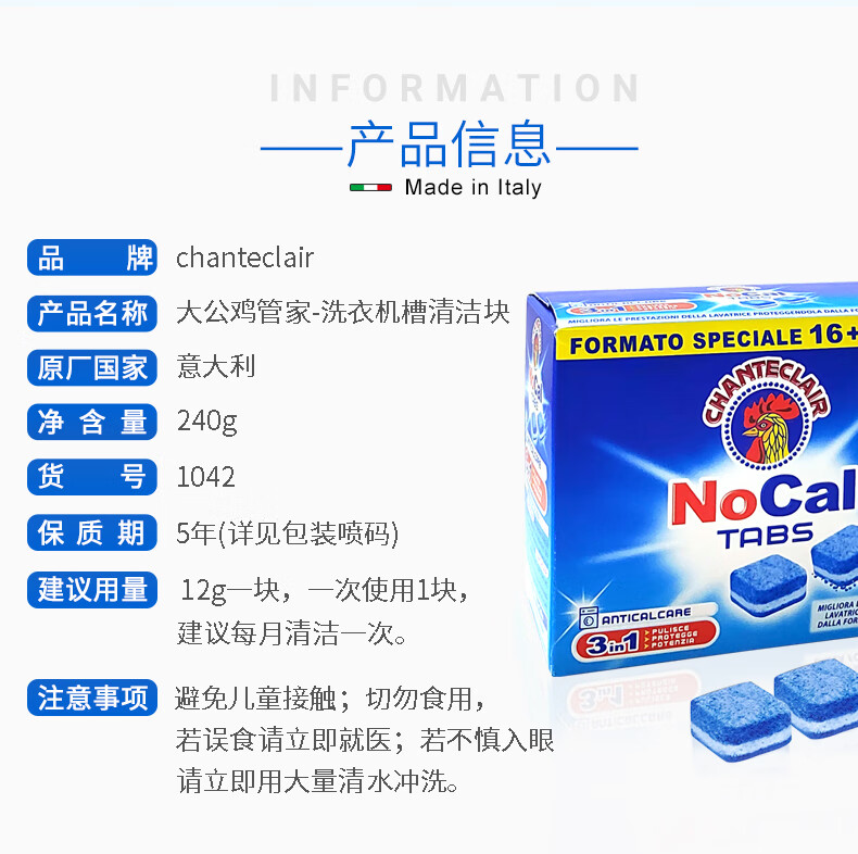 CHANTECLAIR大公鸡管家 洗衣机槽清洁泡腾片 除垢去霉洗衣机槽清洁块12g*20块