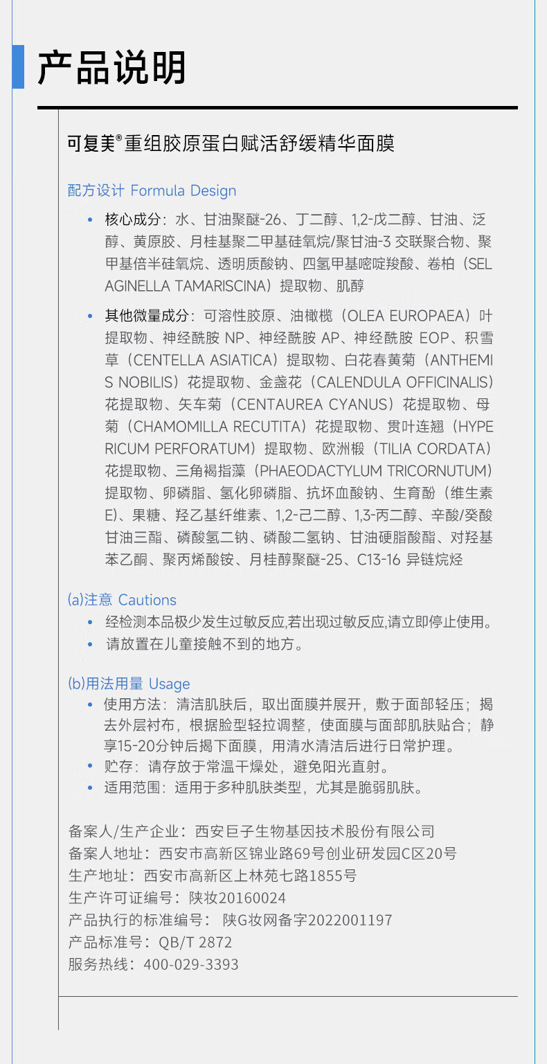 可复美胶原舒舒贴重组胶原蛋白赋活舒缓面膜5片/盒补水修护玻尿酸保湿
