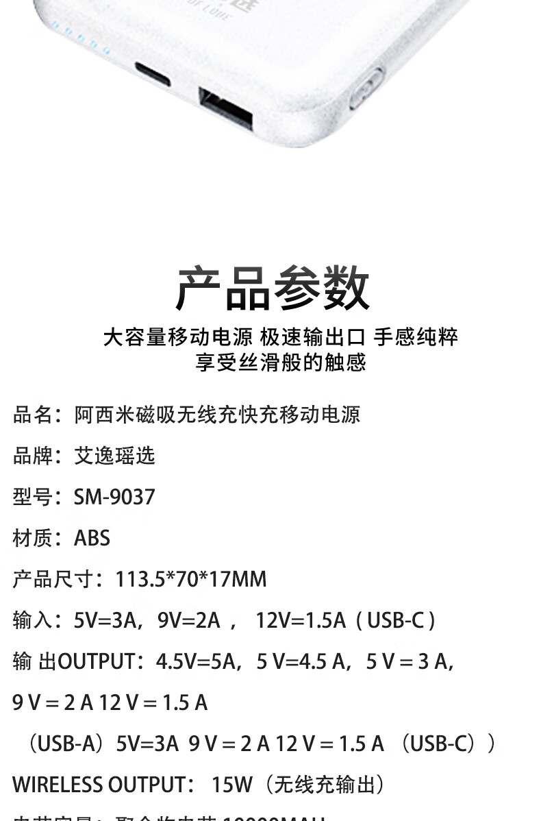 艾逸瑶选阿西米磁吸无线充快充移动电源SM-9037