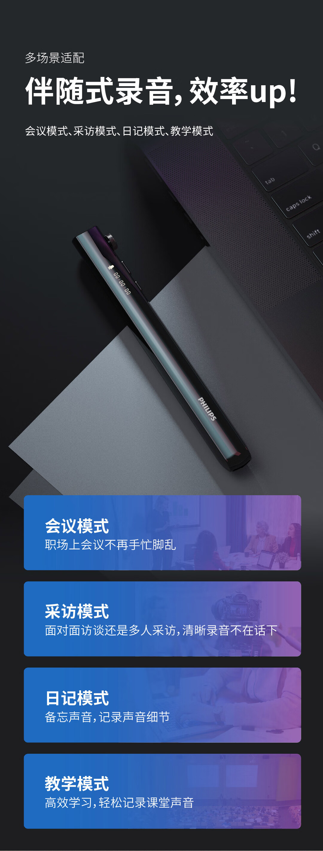 飞利浦(PHILIPS)胸牌录音笔VTR5130 商务会议专业语音转文字高清降噪便携小巧取证一键录音设备32G蓝牙版