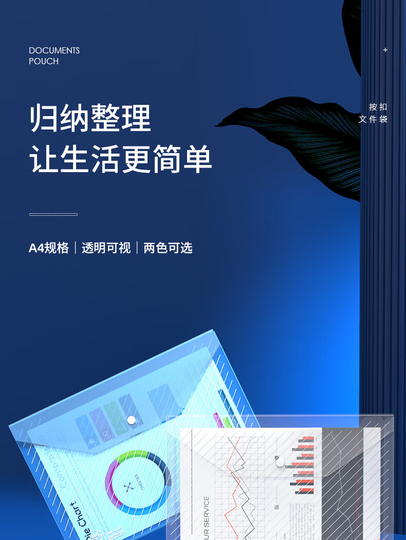 得力(deli)10只A4加厚透明文件袋 按扣资料袋 防水档案袋公文袋 财务票据收纳 5501蓝色