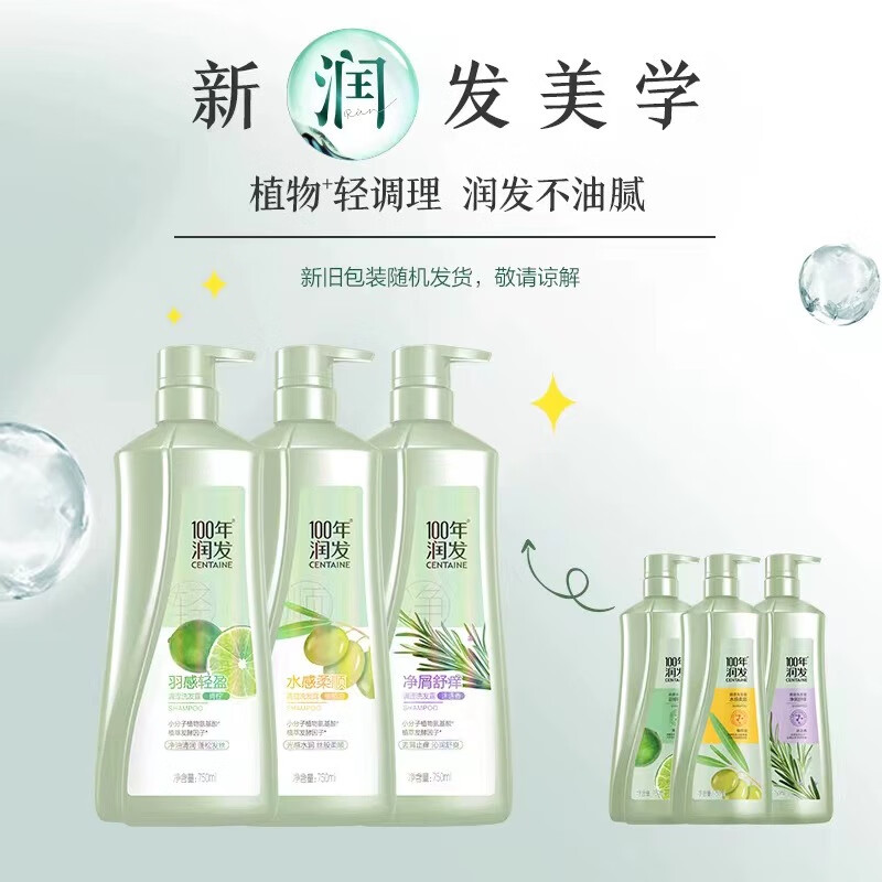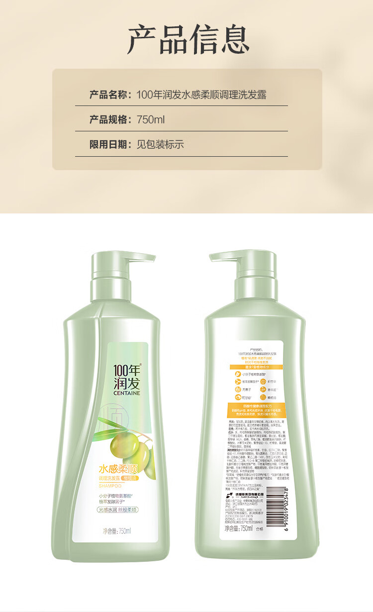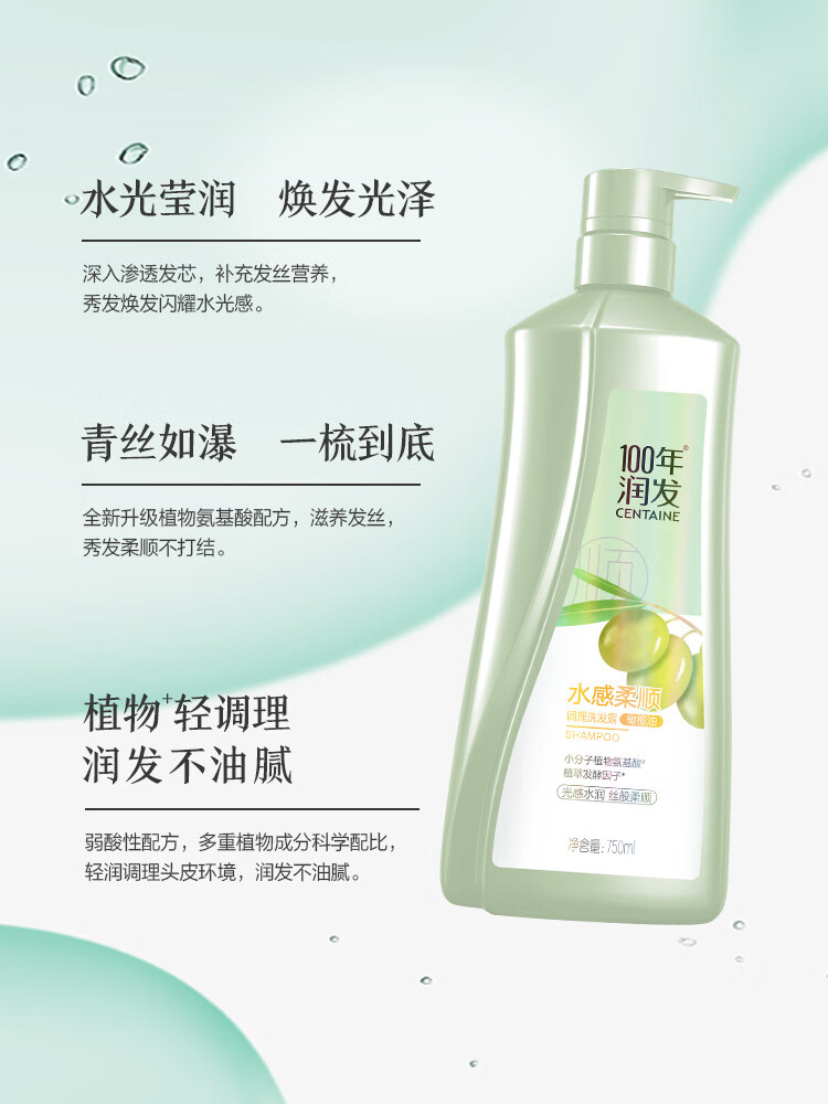 100年润发植物氨基酸调理洗发露 水感柔顺 橄榄油 男女通用 光泽水润 400ml 水感柔顺