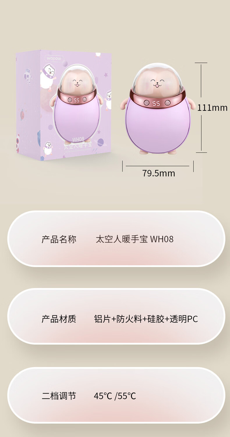沃品WH08 暖手宝数显移动电源二合一可爱充电暖宝宝小巧迷你电暖宝WH08 紫色 8000mAh