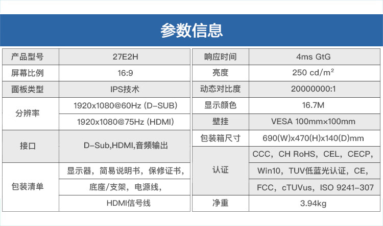 AOC 显示器27英寸全高清IPS技术窄边框HDMI接口商务办公家用液晶电脑显示屏 27E2H 75Hz/爱眼低蓝光不闪屏
