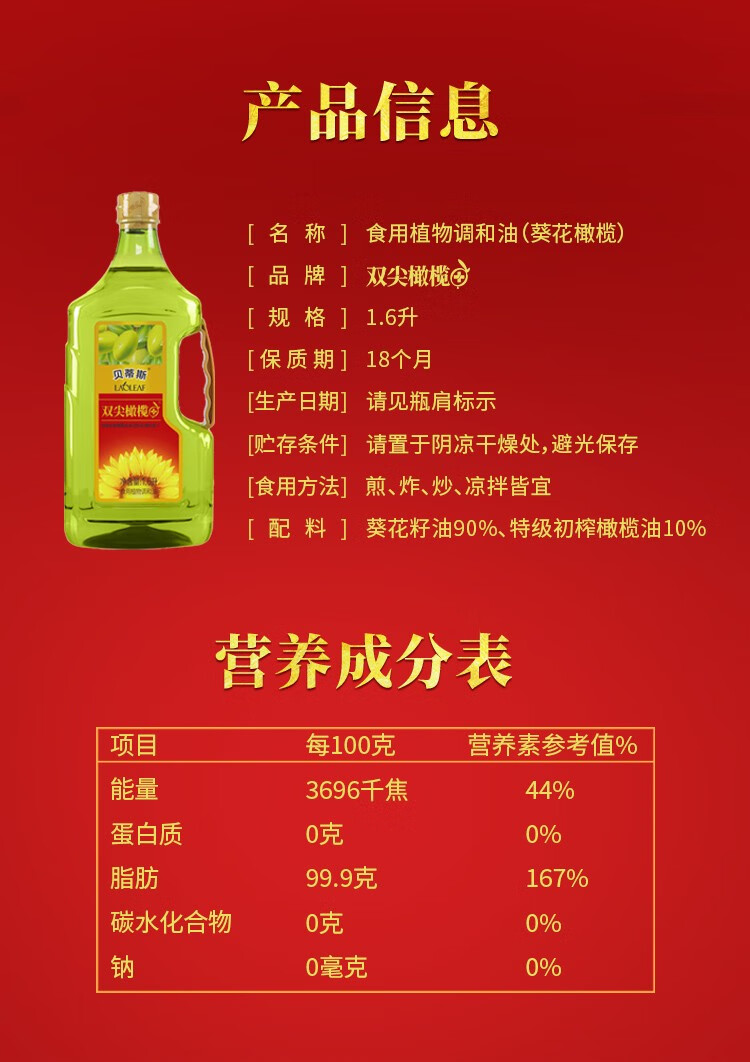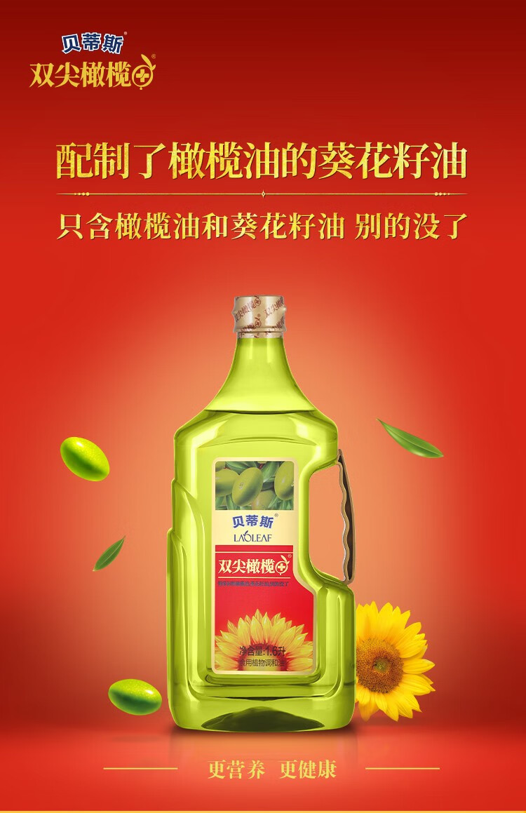 贝蒂斯(BETIS)双尖橄榄+葵花植物调和油1.6L 欧洲进口冷榨工艺 轻油少烟 便携款