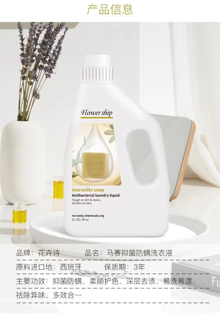花卉诗(Flower ship)洗衣液3kg内衣裤专用清洗液抑菌淡雅留香蓝色妖姬家庭装母婴可用 【抑菌防螨】马赛 3L 1瓶