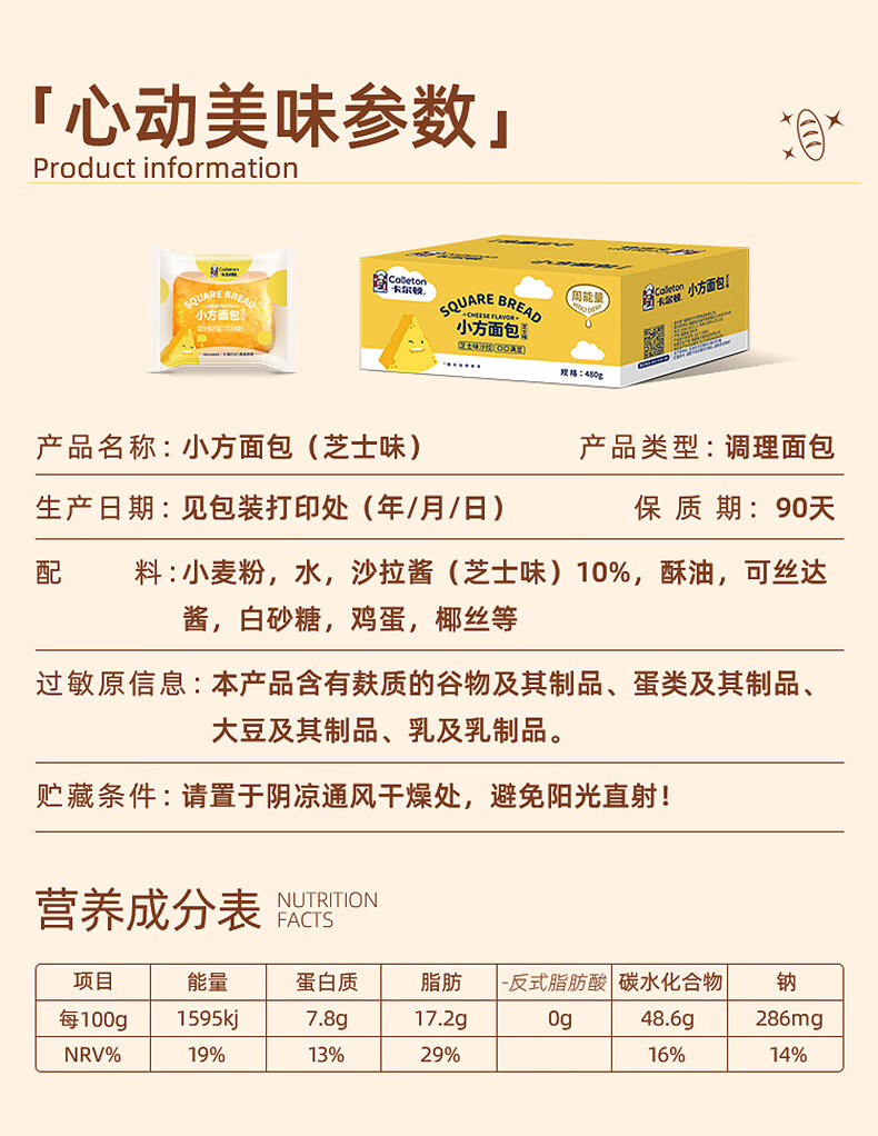 卡尔顿(Calleton)小方面包480g 夹心零食早餐食品营养糕点点心小吃蛋糕整箱 小方面包480g