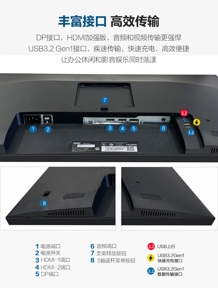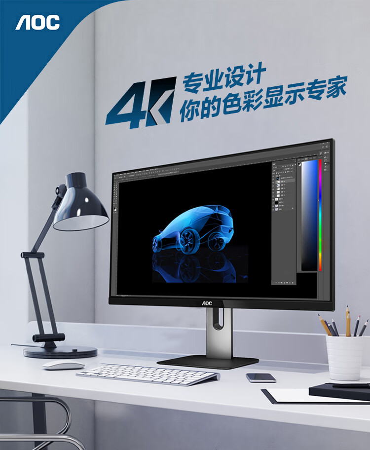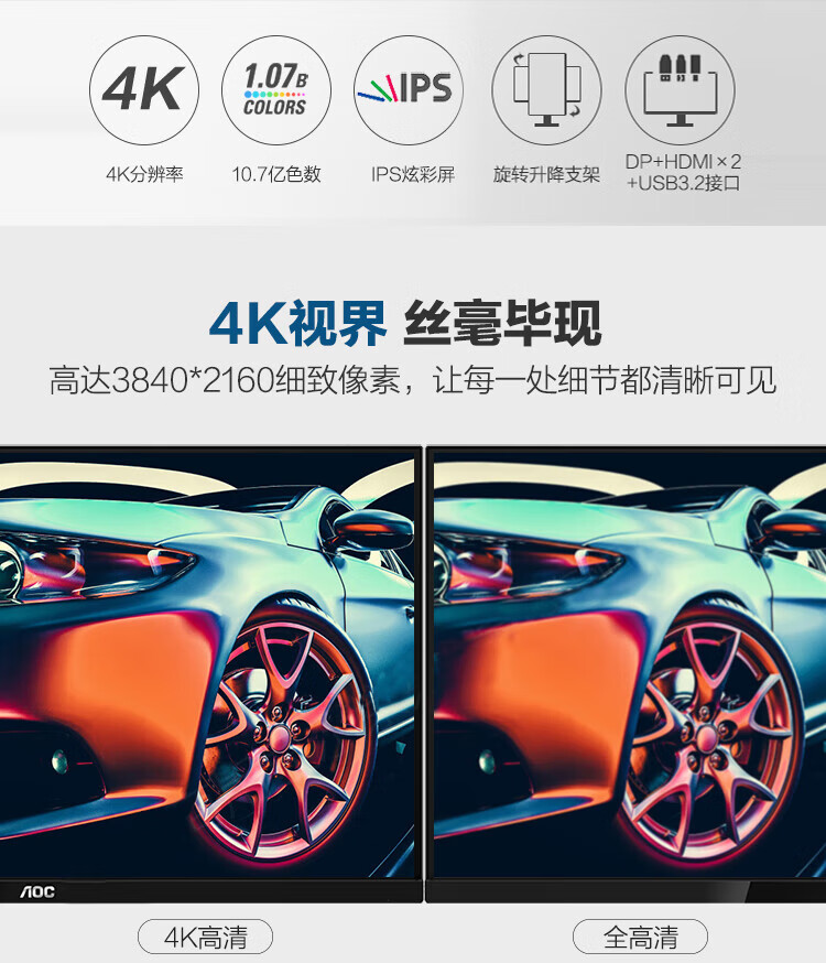 AOC显示器 4K超清27英寸IPS广视角升降旋转低蓝光爱眼不闪专业设计办公电脑显示屏 U27P2C 4K/IPS技术/Type-C