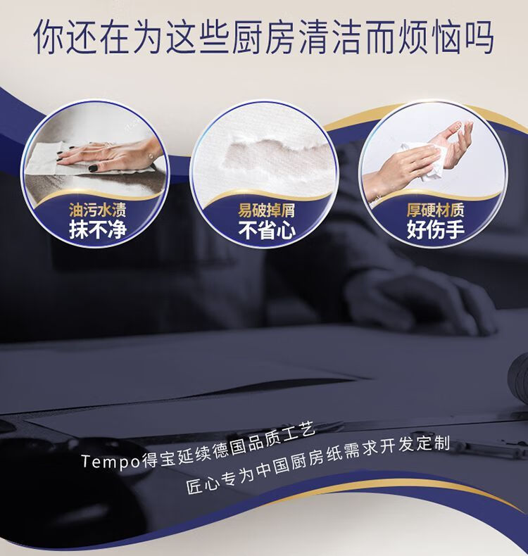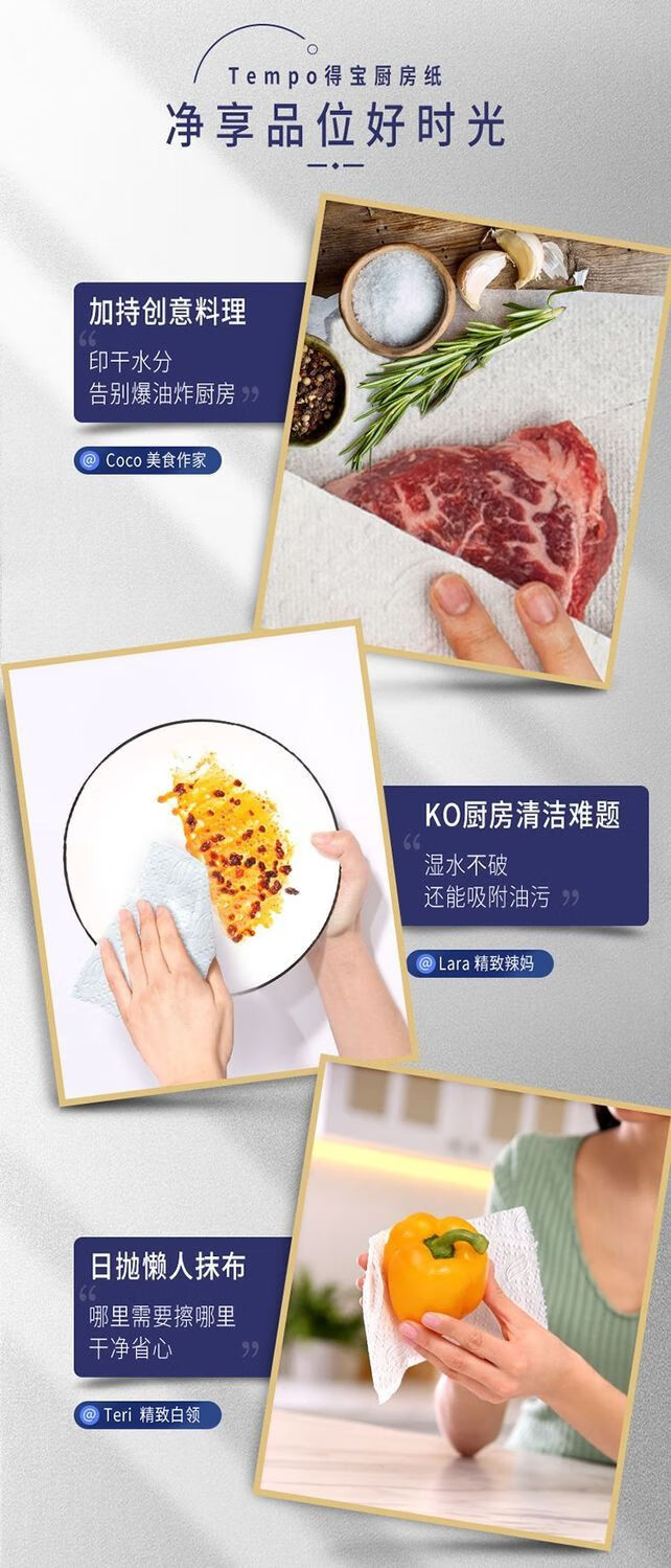 得宝(TEMPO)厨房纸巾88节1/6卷整箱厨房纸食品级吸油加厚大卷德宝厨房纸 88节6大卷_箱【常用囤货】