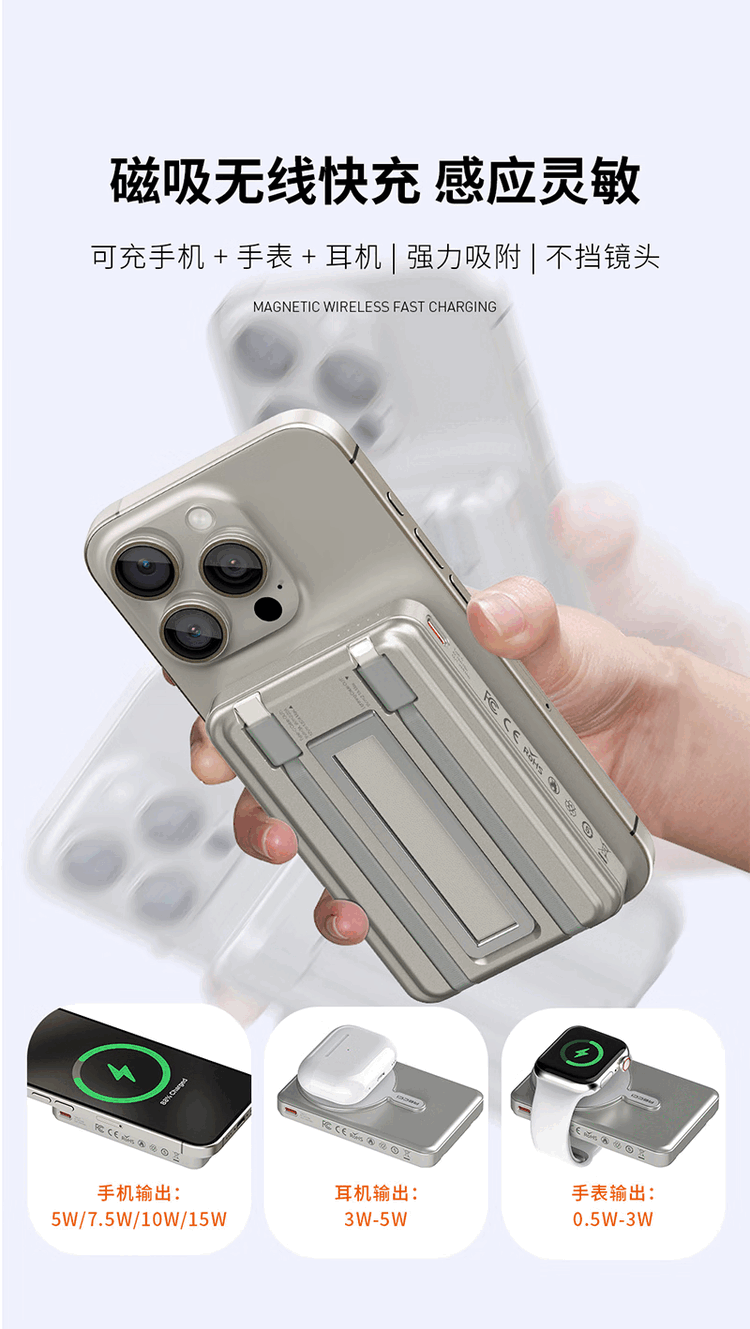 RECCI锐思RPB-W23快充PD20W移动电源无线充15W磁吸充电宝 钛金色