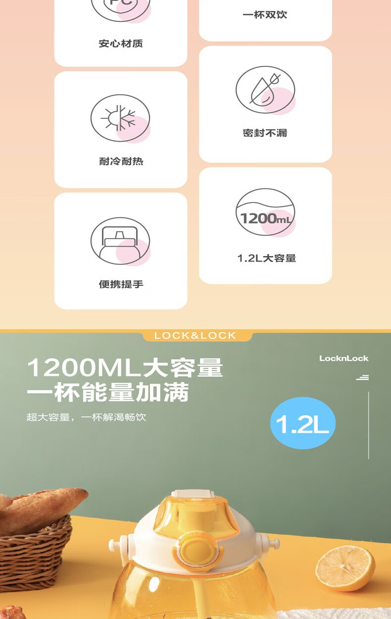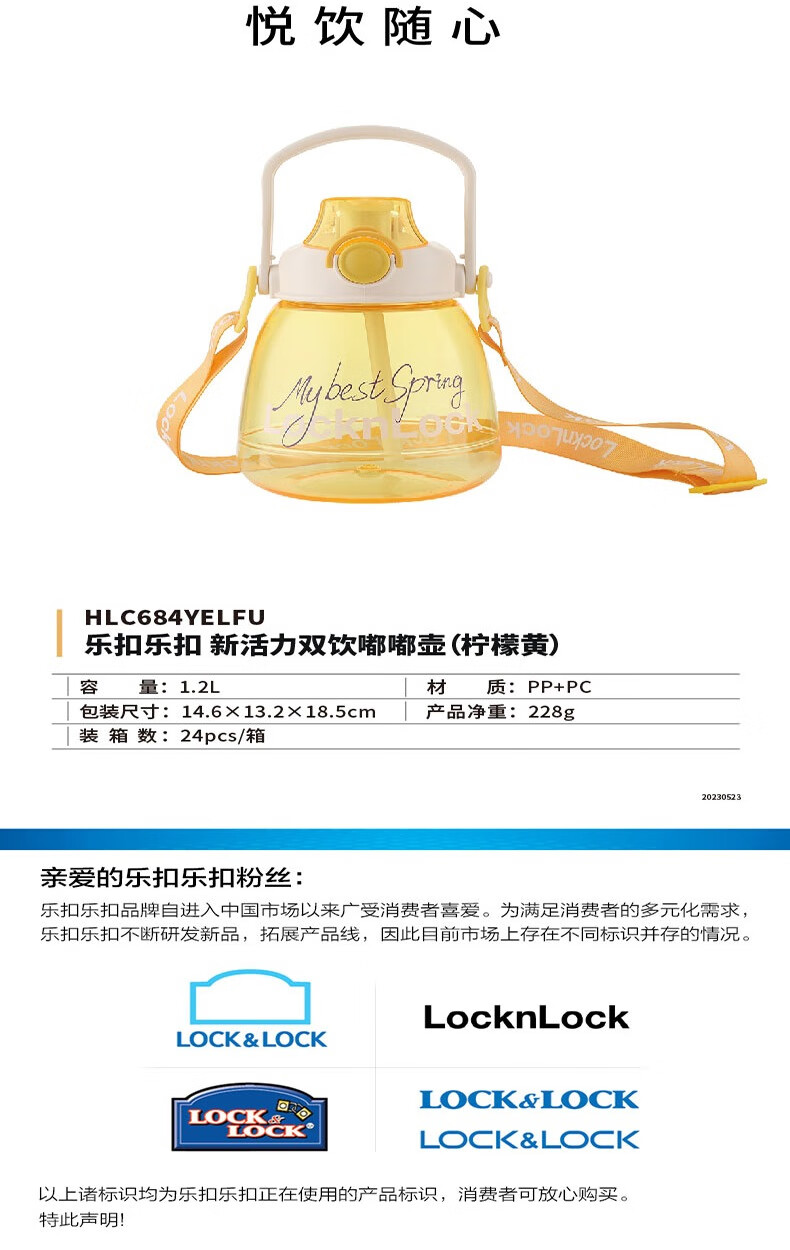乐扣乐扣(locknlock)双饮嘟嘟壶便携提手高颜值大肚杯学生水杯1.2L密封HLC684YELFU