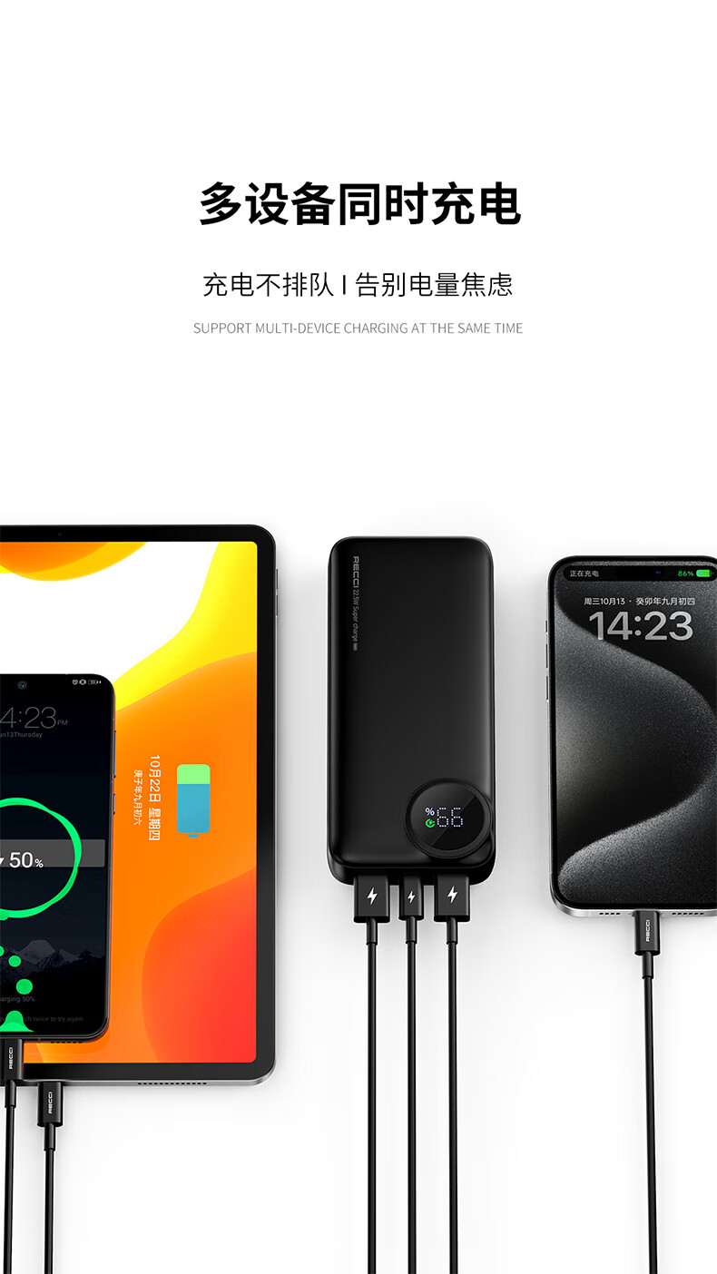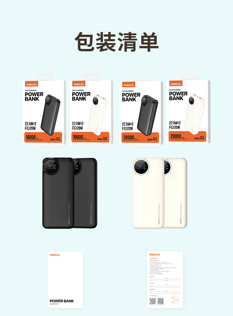 RECCI锐思RPB-P48移动电源大容量两万毫安PD快充20W带数显 支持苹果华为VIVO荣耀10000mAh充电宝 白色 20000 mAh