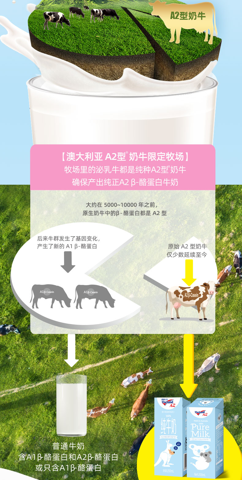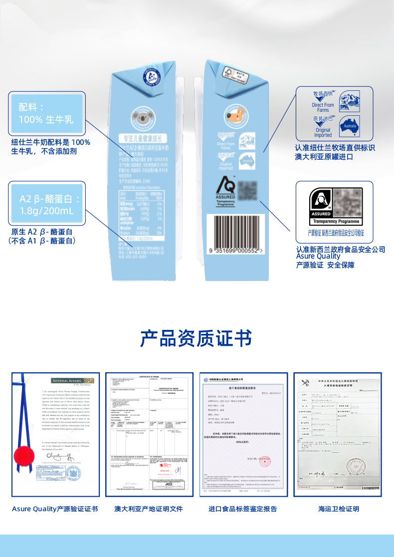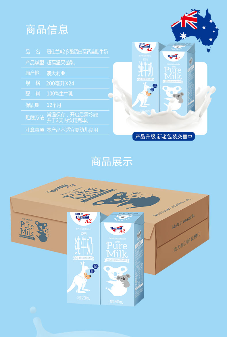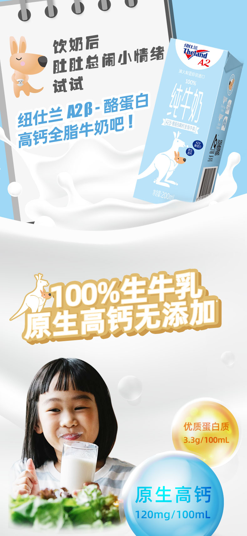 纽仕兰A2β-酪蛋白高钙全脂纯牛奶200ml*6盒/组