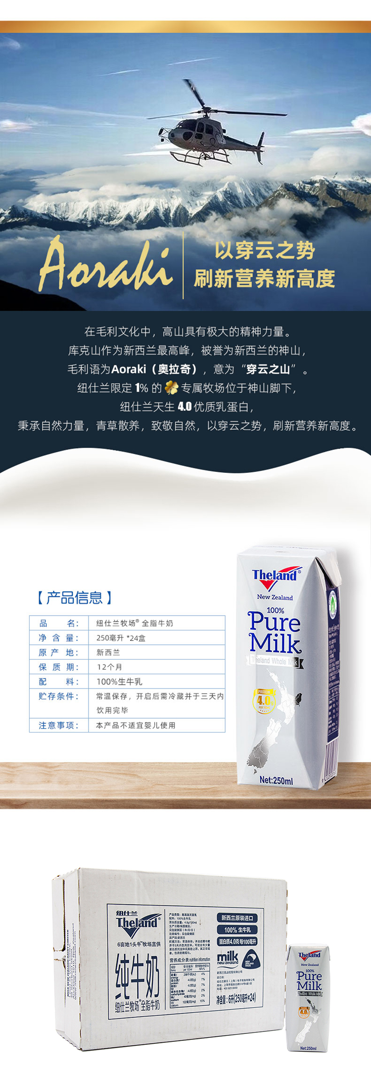 纽仕兰4.0g新西兰进口全脂纯牛奶250ml*24盒/箱